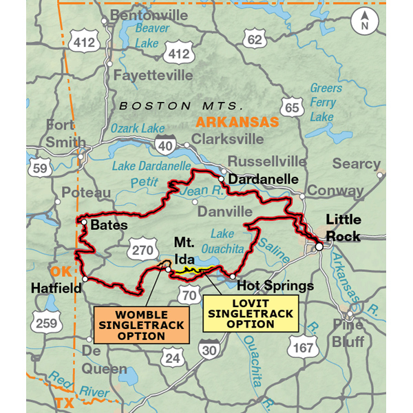 An additional choice on the South Loop features two singletrack options, using the entire Lake Ouachita Vista Trail (LOViT), and the southern portion of the Womble Trail. Both are International Mountain Bike Association (IMBA) EPIC trails.