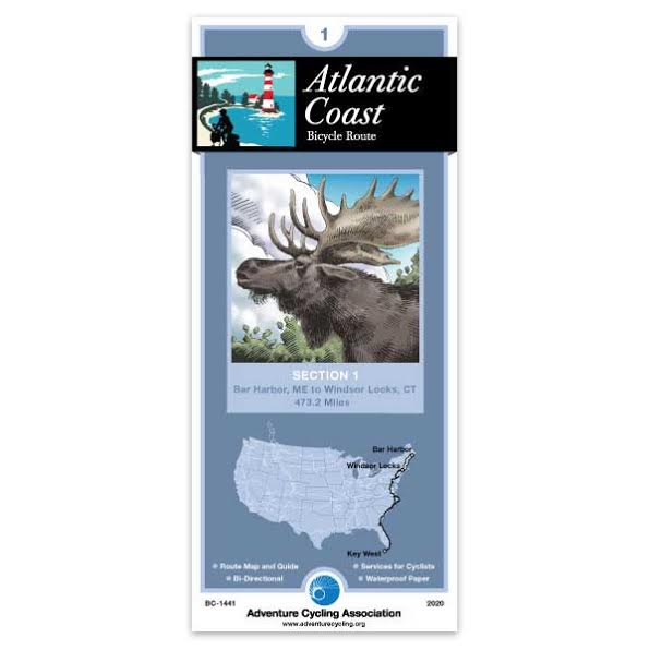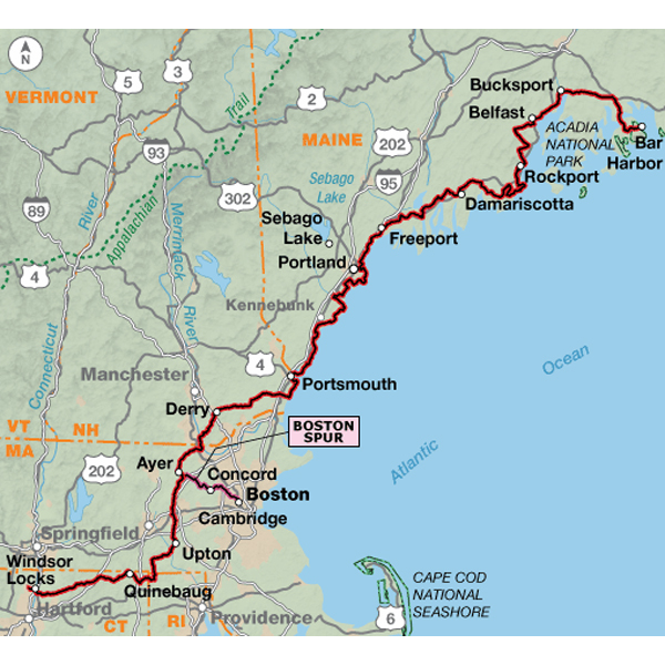 Bar Harbor is located on Mount Desert Island near Acadia National Park. On Mount Desert Island, you'll find some rugged hills and a considerable amount of recreational traffic in the summer months and during the fall color season. South of Freeport, the route stays along the coast past Portsmouth, then heads inland. The route follows very quiet rural county roads from Exeter to the outskirts of Nashua, though traffic increases in and near towns. The 30.6-mile Boston Spur begins in Littleton, and provides access to the city center on a combination of busy thoroughfares and the Minuteman Commuter Bikeway. The terrain of southern Massachusetts, Rhode Island, and northern Connecticut is hillier. The majority of the route in Connecticut is quiet rural county roads except the section into Windsor Locks, which has typical urban congestion. Click on enlargement for detail.