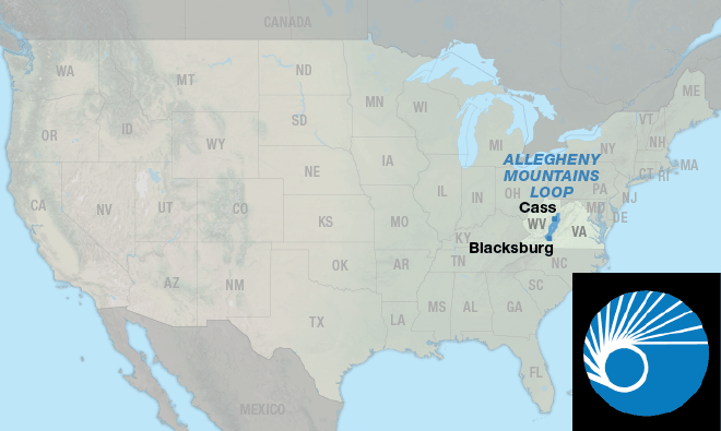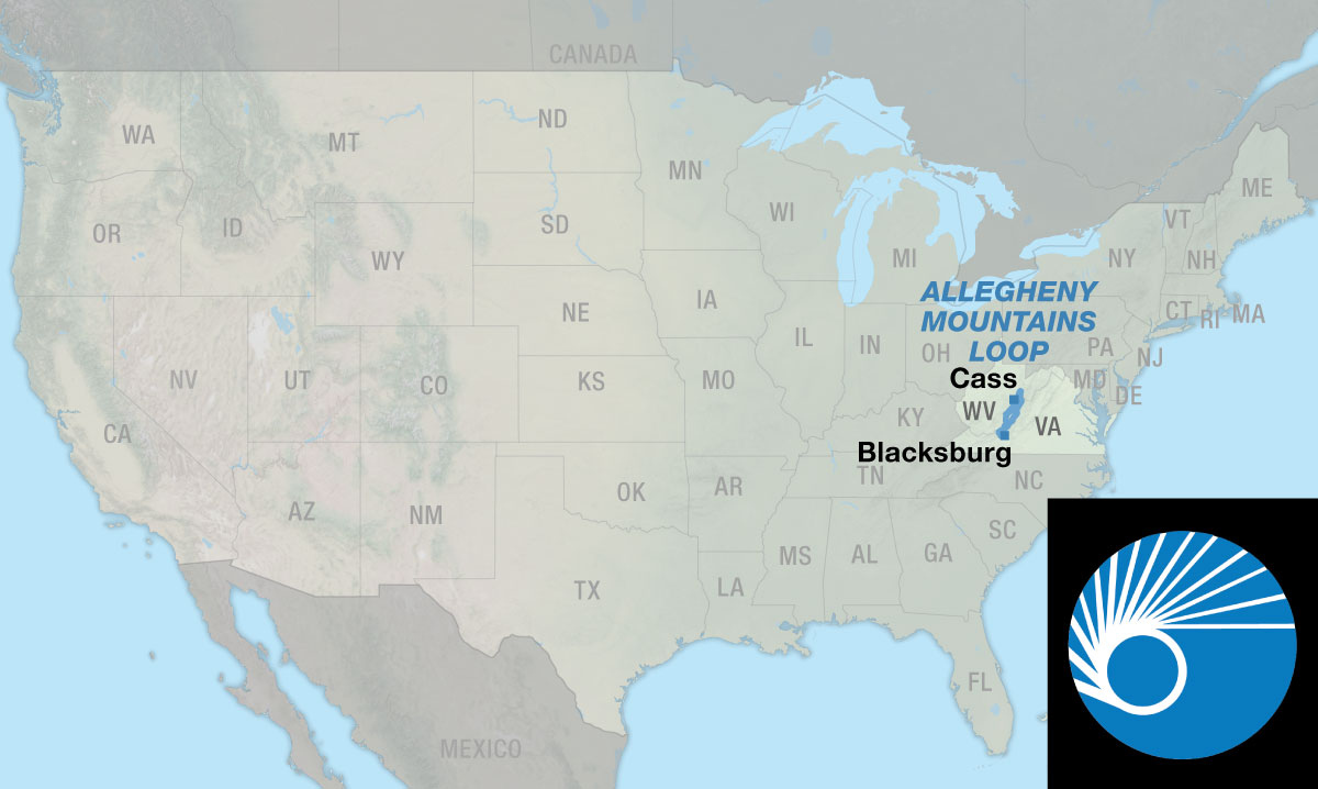 The Allegheny Mountains Loop offers a wide variety of riding types — from pavement to gravel, from gentle grades along river valleys to steep, muscle burning climbs and fast descents over ridges, and from busy U.S. highways to lightly trafficked county roads and rail-trails where no cars are allowed. Besides the main route there are 3 options which give the cyclist alternatives in how much mileage they want to ride. Two of the options are cut-offs to shorten the main loop. The route begins and ends in Blacksburg, Virginia, and crosses back and forth between Virginia and West Virginia several times.