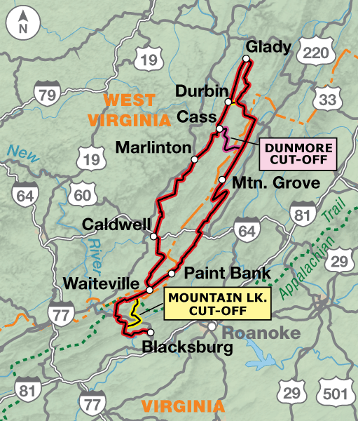 The main route continues on to Mountain Grove. North of Mountain Grove, cyclists will have the first choice of two cut-off options. The 24.5-mile Dunmore Cut-Off heads west on a state highway, goes up and over a major ridge into West Virginia, and ends in Cass.