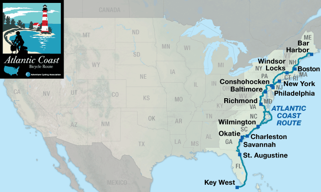 The Atlantic Coast Bicycle Route is one of the more challenging routes that Adventure Cycling has to offer, as it has many hilly areas where granny gears are needed to negotiate the steep climbs. Northwestern Connecticut, the Susquehanna River area in Pennsylvania, and the country roads north of Richmond are extremely hilly. But you do have some easy riding to compensate, such as when biking the paths along the Potomac River in Virginia. While there is some hill climbing upon leaving Richmond, Virginia, generally the terrain is either rolling or flat through the southern states of North and South Carolina, Georgia and Florida.