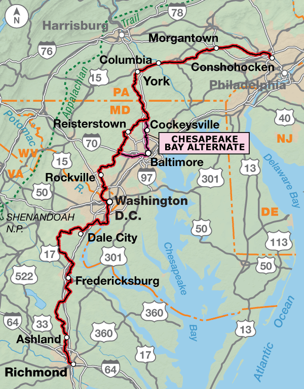 Entering New Jersey, you’ll ride through one of the best areas in the state for bicycling as you travel along the Delaware River. The Delaware Water Gap National Recreation Area is particularly beautiful and gives an other-world meaning to typical images that people have of New Jersey. At Lambertville, the New York City Spur extends eastward for 52 miles to Summit, New Jersey, where you can take a train into New York City. The main route heads west into Pennsylvania through productive farms and many hills. Downtown Philadelphia is a short distance from the route via the Schuylkill River Bike Path. You’ll ride through Valley Forge National Historic Park. The route traverses Lancaster County, which is home to many Amish families. Beginning in York, it follows the York County Heritage Trail which becomes Torrey C. Brown Trail in northern Maryland. The route swings west around the outskirts of Baltimore, though you can take the alternate through the city if you prefer. There are more farms in northern Maryland, which will turn into suburban sprawl as you reach the Washington, D.C., metropolitan area.