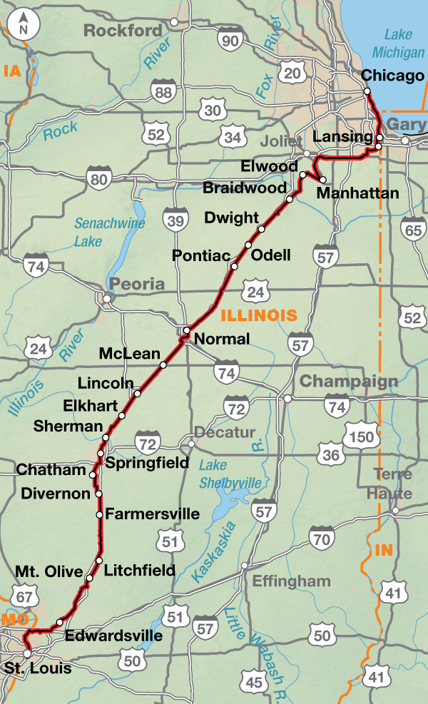 Right from the start in Chicago, Illinois, Bicycle Route 66 diverges from Historic Route 66 due to heavy traffic conditions. The official start location on Lake Michigan in Grant Park at Buckingham Fountain allows the use of multiple bike paths and trails along with city streets out of the congestion to meet up with Historic Route 66 in Elwood. A short distance later, the route begins its parallel path with I-55 passing through the capital city of Springfield as well as many smaller communities.