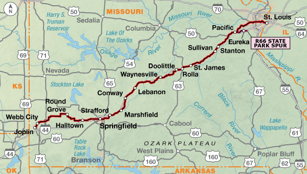 The Riverfront Trail leads cyclists into the city and past the Gateway Arch commemorating the launch of the Lewis & Clark Corps of Discovery Expedition. Once through the suburbs on city and county roads, Bicycle Route 66 begins paralleling I-44 mostly on frontage roads and some county highways. Not far out of St. Louis, cyclists will encounter the rolling hills of the northern reaches of the Ozark Mountains. West of Springfield, Missouri, the route leaves Historic 66 in favor of quieter county roads and state highways. Bicycle Route 66 rejoins Historic Route 66 east of Joplin.