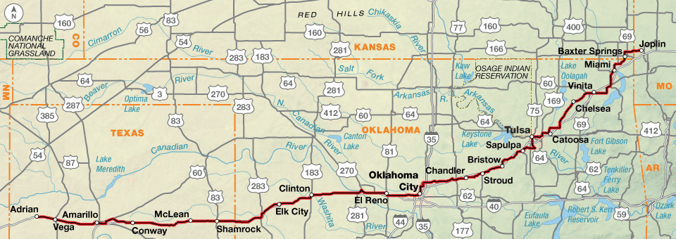 Once the route reaches the Oklahoma border, the flat to rolling landscape will encompass a variety of different prairie types until it reaches the Great Plains of the Texas panhandle. In general, the terrain across Oklahoma is a gradual uphill again paralleling interstates, first I-44, then I-40.