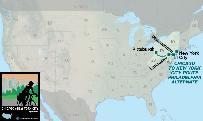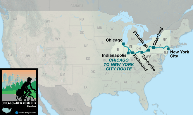 The Chicago to New York City Bicycle Route includes a main route and the Philadelphia Alternate, which stretches from Pittsburgh, Pennsylvania to New York City. This page describes the 1,160.3-mile main route from Chicago, Illinois to New York City, New York. If you choose to combine the main route with the Philadelphia Alternate the mileage is 1,172.9 miles. On section 3, in Pittsburgh, is the intersection where you’ll switch maps from following the main route to the Philadelphia Alternate.