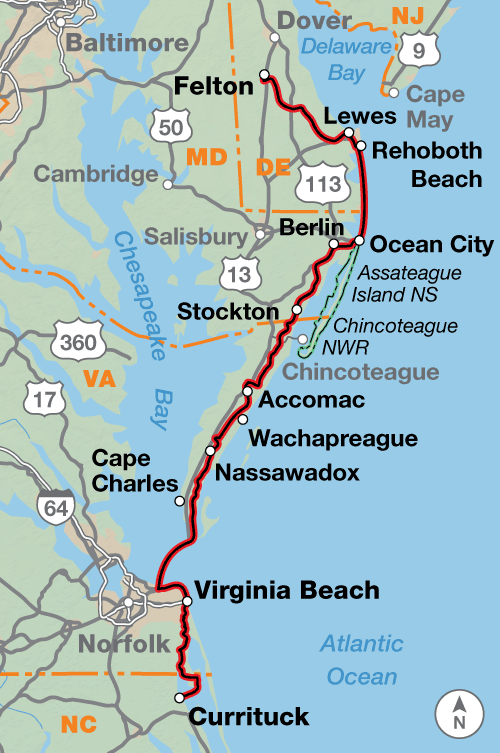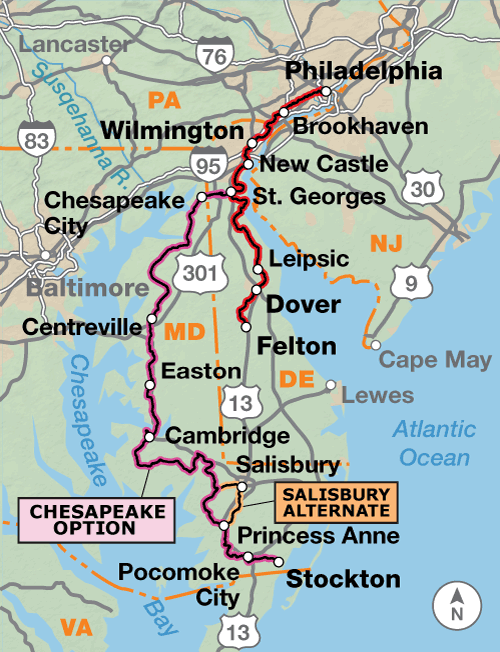 At the small hamlet of St. Georges, reached via the smooth pavement of the Michael Castle Trail paralleling the Chesapeake and Delaware Canal, the 193.5-mi. Chesapeake Option departs the main route under the U.S. 13 bridge. Southward, the main route quickly leaves the U.S. 13 corridor, utilizing secondary state and county roads through a bevy of state and federal wildlife areas to the state capital in Dover. Near the section-end town of Felton, the route joins Delaware Bike Route 1 and closely follows until the Georgetown-Lewes and Junction and Breakwater Trails deliver the rider to the famous beach boardwalks of Rehoboth Beach. Traversing beach barrier islands becomes the name of the game along SR 1 for several miles to the south, across the Maryland border and ultimately all the way to Ocean City. You’ll be sharing this stretch of highway with traffic in summer months, but cycling accommodations in the form of signage, painted shoulders/sharrows, and numerous bike paths should help ease the passage.