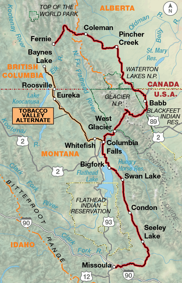 The Tobacco Valley Alternate, which bypasses Glacier and Waterton Lakes National Parks, is 100 miles in length. South of the border, U.S. 93 carries some high speed traffic and trucks, so the route uses parallel smaller roads wherever possible. To complete a loop to Fernie, BC, you will need section 1 of the Great Parks North Route.
