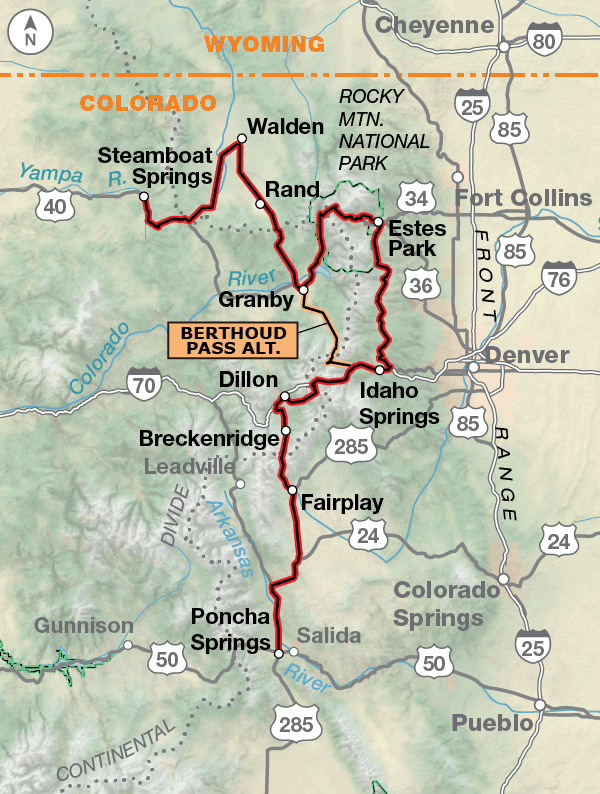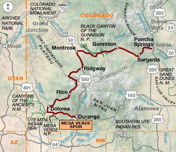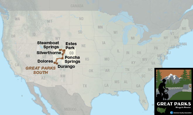 The route begins in northern Colorado in the ski town of Steamboat Springs. After a gut-busting climb out of Steamboat Springs to Rabbit Ears Pass and Muddy Pass, you’ll find open grazing land and national forest lands heading to Granby, near the southern entrance to Rocky Mountain National Park. Traffic can be heavy approaching the park and throughout the park, and you’ll spend many hours climbing and descending Trail Ridge Road. From Estes Park to Georgetown, this area is the playground for Denver, the surrounding communities on the Front Range and also much of the nation. Communities from Keystone to Breckenridge have become major year-round tourist destinations, so be prepared for traffic and recreational vehicles. There is a very good paved trail system in Summit County. South of Fairplay, the route becomes rural and traverses the high, open land of South Park. After crossing Trout Creek Pass, the route drops into the Arkansas River Valley near Buena Vista. The western slope of the Colorado Rocky Mountains is old mining country, from Salida all the way into Durango. Around Dolores, the mountains give way to the dry, open Four Corners region, highlighted by Mesa Verde National Park. Durango is the southern terminus of the historic Durango and Silverton Narrow Gauge Railroad, the only remaining regularly scheduled narrow-gauge passenger train.