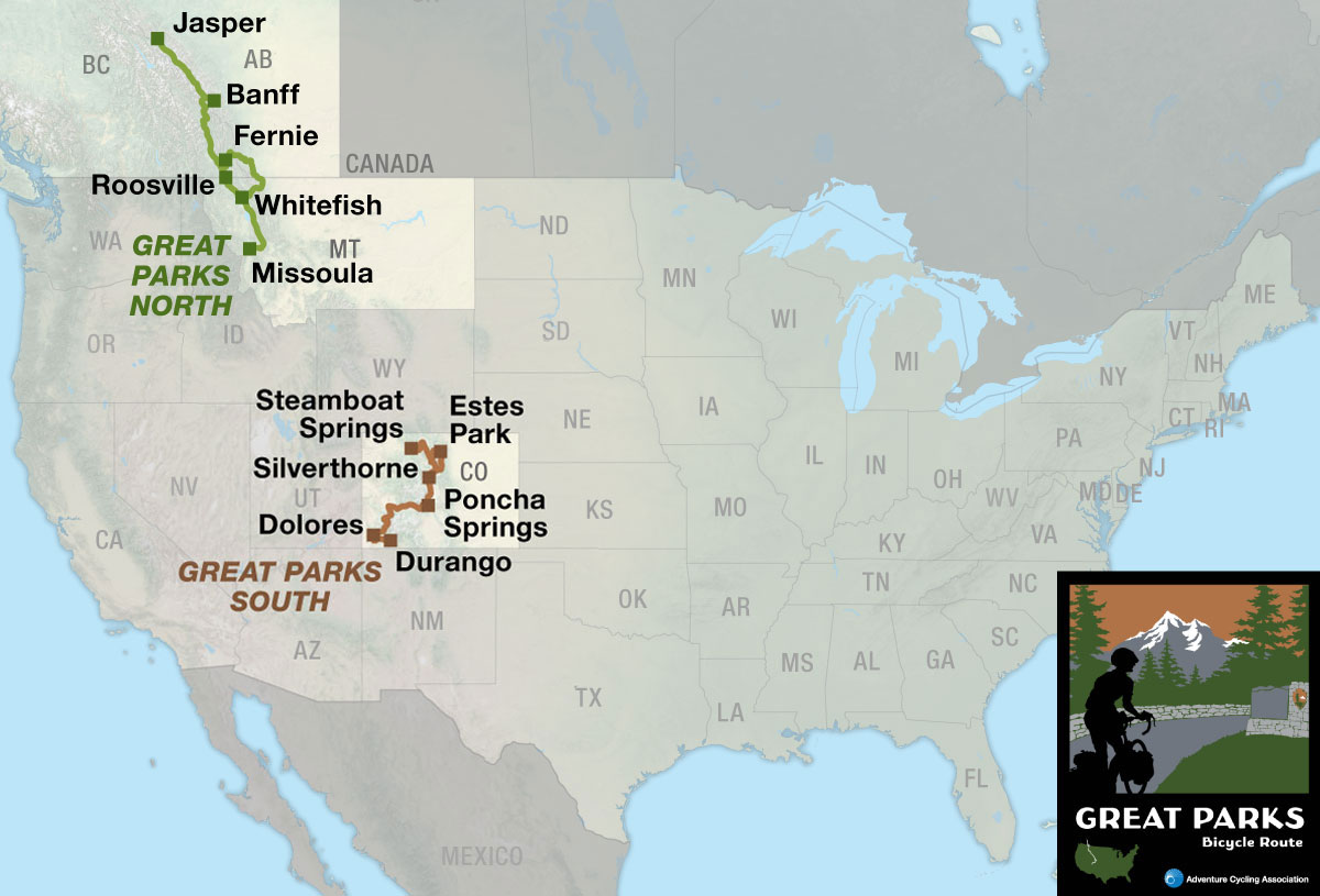 These two separate routes traverse the Rocky Mountain national parks of Canada and the U.S. When combined with TransAmerica Trail sections 4, 5, and 6, it is a continuous route from Jasper, Alberta, to Durango, Colorado. Below, you’ll find details on both the North and South routes.