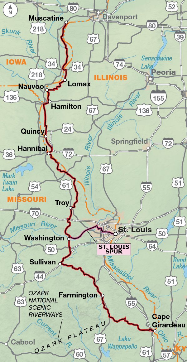Starting in Muscatine, Iowa, you ride on the west side of the river, beside the Mark Twain National Wildlife Refuge. You’ll particularly enjoy the 11-mile stretch between Nauvoo and Hamilton, where you’ll be alongside the Mississippi River. After crossing the bridge into Hannibal, Missouri, you will see a town most famous as the boyhood home of Samuel Clemens (a.k.a. Mark Twain). This town has tourist sites based on characters and places from his books, e.g., Tom Sawyer’s fence, Becky Thatcher’s home, Grant’s Drug Store, and Mark Twain’s Cave. Heading southward, you’ll encounter hilly farm country. If you want, you can take a side trip into St. Louis to see the famous Gateway Arch.