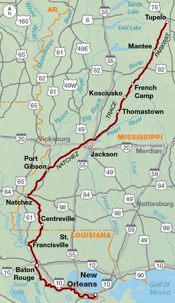 The route on the Natchez Trace follows a two-lane road in a national park that continues through Alabama and Mississippi, with no commercial traffic or services permitted. All services, except for occasional campgrounds, are off the route in nearby towns. You’ll encounter fellow bicyclists and enjoy many hiking trails, boardwalks, waterfalls, and historical sites along the Trace. At the end of the Trace, you can visit the antebellum homes in Natchez, Mississippi. The route goes through the rural countryside in northern Louisiana. Between Baton Rouge and New Orleans the route follows portions of the mostly paved Mississippi River Levee Path.
