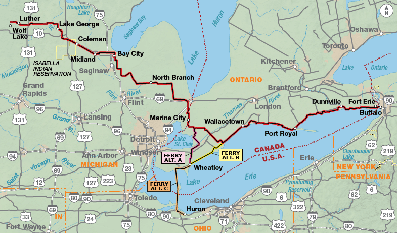 The route begins near Wolf Lake, Michigan. It passes through the sparsely populated rural landscape of rolling fields and forests of west-central Michigan to Clare. From here, the route follows 30 miles of the paved Pere Marquette Rail-Trail to Midland. The rail-trail ends in a park at the confluence of the Tittabawassee and Chippewa rivers, spanned by the “Tridge,” a unique three-legged bridge spanning the confluence. The route passes through pleasant residential neighborhoods in Midland to begin its traverse of the “thumb” of Michigan. From Bay City, the route stair-steps across and down the “thumb” to the city of St. Clair and then along the St. Clair River to Marine City. The “thumb” is a nearly treeless area of intensively cultivated farmland and is almost flat. At Marine City, the route uses a ferry to cross the St. Clair River to Sombra in Ontario, Canada. There is a short and pleasant ride along the St. Clair River, and then the route turns inland to the city of Wallaceburg. Here the route splits, with the main route continuing to Fort Erie, Ontario, and the Ferry Alternate going southward for ferry connections to Sandusky, Ohio and the Northern Tier Route. The area surrounding Leamington is the tomato-farming region of Canada, and Leamington is a major tomato-processing center. Those riding through the area at harvest will see mechanical tomato harvesters in fields and trucks with huge loads of tomatoes.