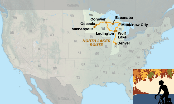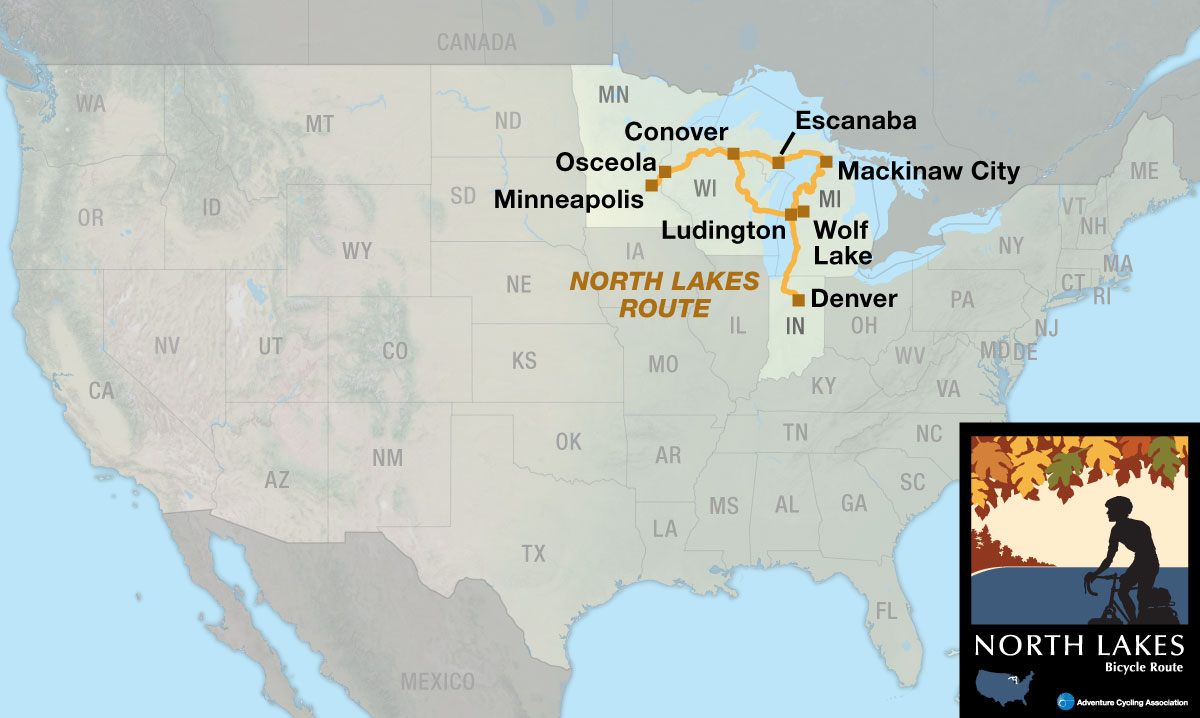 The North Lakes Route is generally rolling and one of Adventure Cycling’s easier routes to ride. There are no dramatic climbs over mountain passes. This is not to say that there aren’t any short, steep climbs, but difficult climbing is not the general terrain of this route.