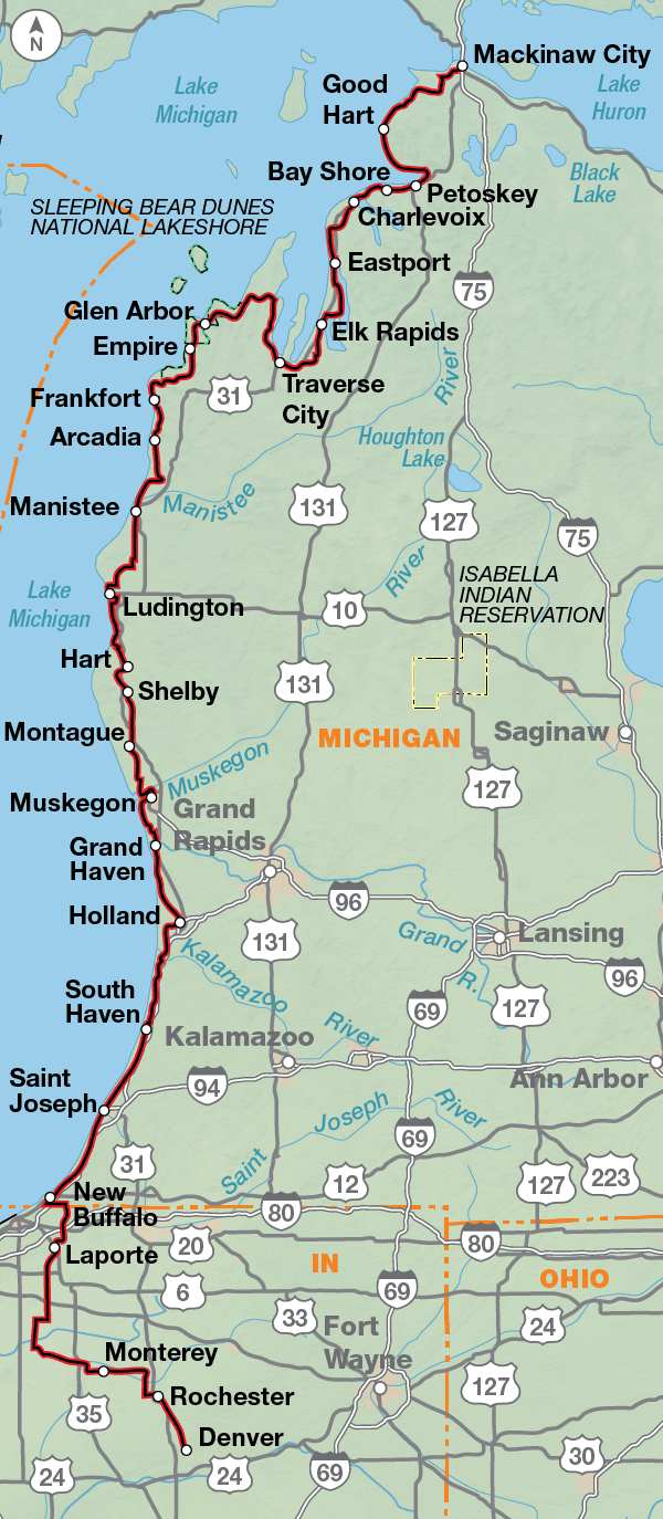 From Suttons Bay, the route crosses the Leelanau Peninsula to the Sleeping Bear Dunes National Lakeshore. From here going south, you’ll follow rural roads and state highways through small vacation towns along the Lake Michigan shore. Please be cautious of tourist traffic during summer months.