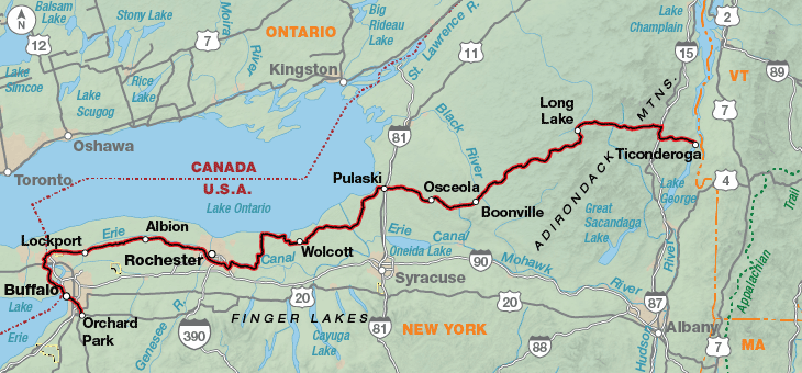 After crossing the Peace Bridge into Canada you’ll follow one of the most scenic recreational trails in North America along the Niagara River to Niagara Falls. Take the cable car ride across the Whirlpool Rapids and visit the other attractions along the trail. Then you’ll cross back into the U.S., enjoying the view of the Niagara Gorge. Heading east, the route uses the Erie Canalway Trail for 86.5 miles along a waterway dripping with history. Take the time to explore the towns along the canal. At Palmyra, the route turns north to Lake Ontario, where it follows the lake shore to Sodus Bay, dips inland to Fulton, and then leaves the Great Lakes to cross the Adirondack Mountains and arrive at Ticonderoga on Lake Champlain. A visit to Fort Ticonderoga will give meaning to Revolutionary War history.
