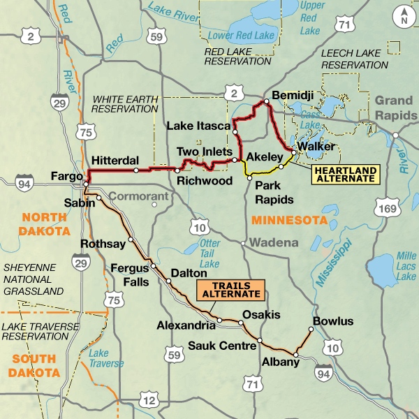 *Oil and gas development in the Bakken Oil Shale Field of western North Dakota and northeastern Montana prompted a change in routing in 2012 to avoid the area around Williston, North Dakota. Because many roads with minimal to no shoulders now have high levels of truck traffic, and are felt to be unsafe for bicyclists, the route was moved to go through southern North Dakota.