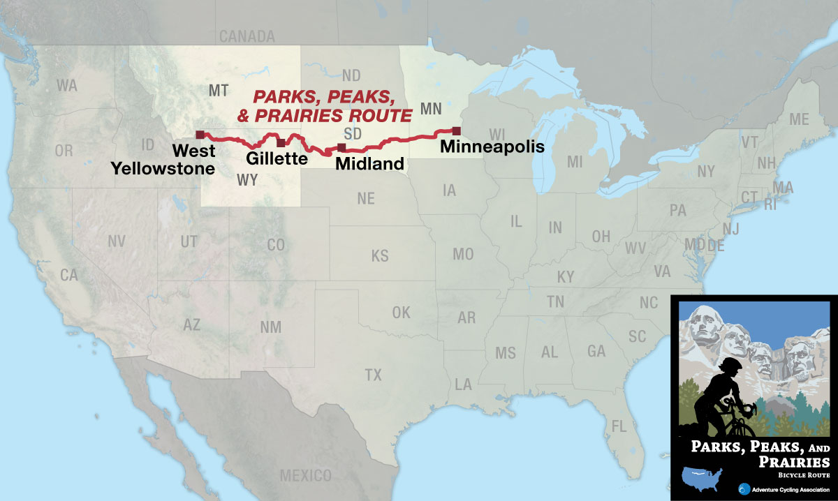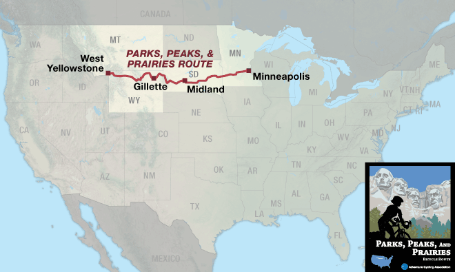 The Parks, Peaks, and Prairies Bicycle Route fulfills the request of so many cyclists visiting the ACA headquarters in Missoula for a northern connector between the TransAmerica Trail and the Northern Tier Bicycle Route — one that strings together the iconic American parks of Yellowstone, Devils Tower, Mt. Rushmore, Badlands, and the famous Black Hills of South Dakota.