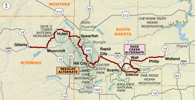 The route climbs over two major mountain passes, both in Wyoming. Sylvan Pass, at 8,524 feet, marks the beginning of the descent into the Bighorn Basin from the high elevation Yellowstone Plateau. Powder River Pass, 9,675 feet, is the route’s highest point at the crest of the Bighorn Mountains. The climb to Powder River Pass from either direction is one of the most significant climbs in the entire Adventure Cycling Route Network. The terrain becomes more rolling in the vast prairie between Buffalo and Moorcroft as it dips in and out of river and creek drainages. In the island mountain range of the Black Hills, expect similar elevation change but more tortuous roads than in the main Rockies. Short, frequent grades of 10% or greater can occur on these roads. For 34 miles, the climbing is smoothed by the steady railroad grade of the Mickelson Trail, though there are a few short, steep hills. The surface of the trail is crushed limestone and gravel, but ponding can occur in early season rain. The Needles Alternate between Hill City and Keystone offers some of the most strenuous climbing on the entire route. This optional route follows the outrageously scenic Needles Highway and Iron Mountain Road, two steep, narrow, and winding roads that are dotted with several tunnels and loops. Traffic can be heavy, but speeds are low and the pavement is in good shape. East of Rapid City, the Badlands of South Dakota offer more climbing in the form of an ascent of the “wall” along the paved main route or a backdoor, off-pavement grassland option along the Sage Creek Alternate. In heavy rain, the high clay-content alternate roads can turn into a thin gumbo capable of coating even the most well-lubed drivetrain. East of Wall, the route flattens out entering the main expanse of the Great Plains. The greatest form of elevation change here occurs where the route crosses or traverses major watercourses like the Missouri, Minnesota, and Mississippi Rivers. Expect localized climbs of hundreds of feet in these areas. Otherwise, the route follows county and state highways that undulate to the sweep of the prairie. The final 74 miles of the route assumes a level rail-trail grade on mostly paved surfaces, lasting through to the eastern terminus of the route in Fort Snelling State Park near the Minneapolis-St. Paul Airport.