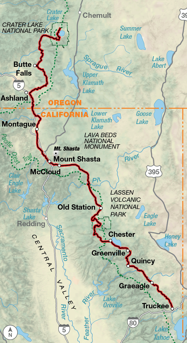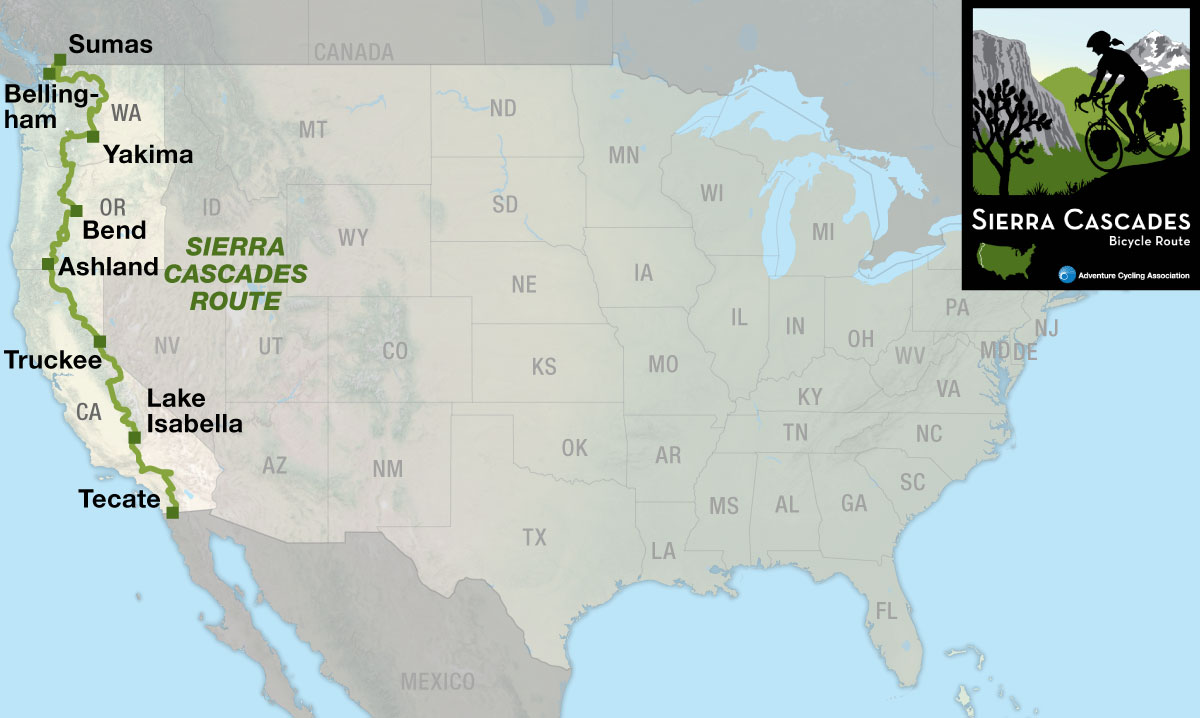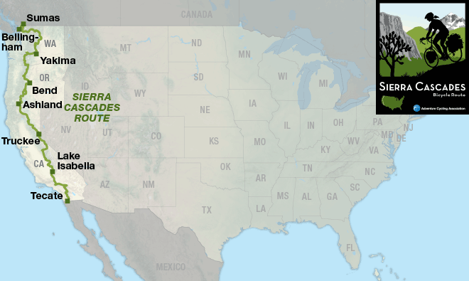 The Sierra Cascades Bicycle Route runs roughly parallel to the Pacific Crest National Scenic Trail along the Cascade Range and Sierra Nevada from the Canadian border to the Mexican border. This route is characterized by volcanoes, long stretches of forested countryside, busy towns, deserts, orchards and everything in between.
