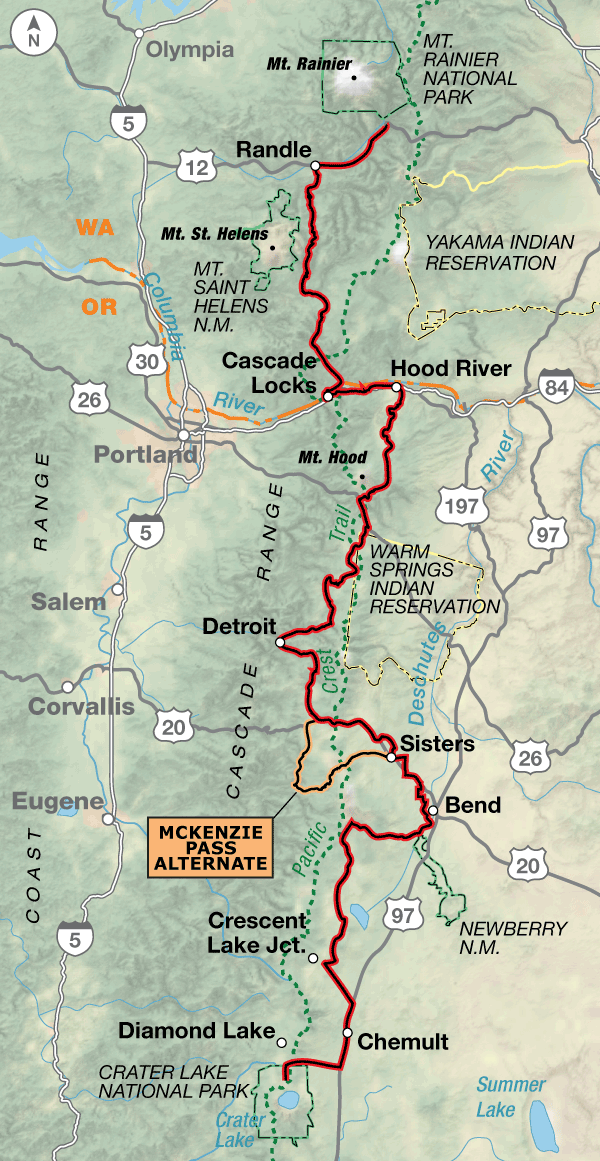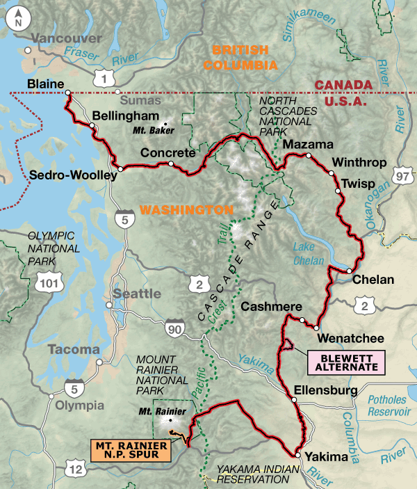 Section 1 begins at the Peace Arch Historical State Park next to the Canadian/U.S. border in Blaine, Washington. The first 30 miles of the route stays low on the coastal plain as it meanders through Bellingham, an outdoorsy college town that boasts train, plane and bus services. In Sedro-Woolley the route joins the Skagit River and parallels State Highway 20, which are followed eastward and upward into the main heart of the Cascade Range. Along the entire route you’ll cross 20 passes and 25 Pacific Crest Trail crossings, though some of these are unmarked. Due to heavy snow, State Highway 20 through the North Cascades National Park is usually only open between late April and late November. From Sedro-Woolley to Yakima this route shares the same routing with our Northern Tier and Washington Parks routes. On the east side you’ll be traveling through orchard country, where the roads will get busier during harvest times. West of Yakima the route heads to Mt. Rainier National Park. A spur is shown to the Paradise Visitor Center within the Park. Expect heavy traffic in and near the Park from June through August.