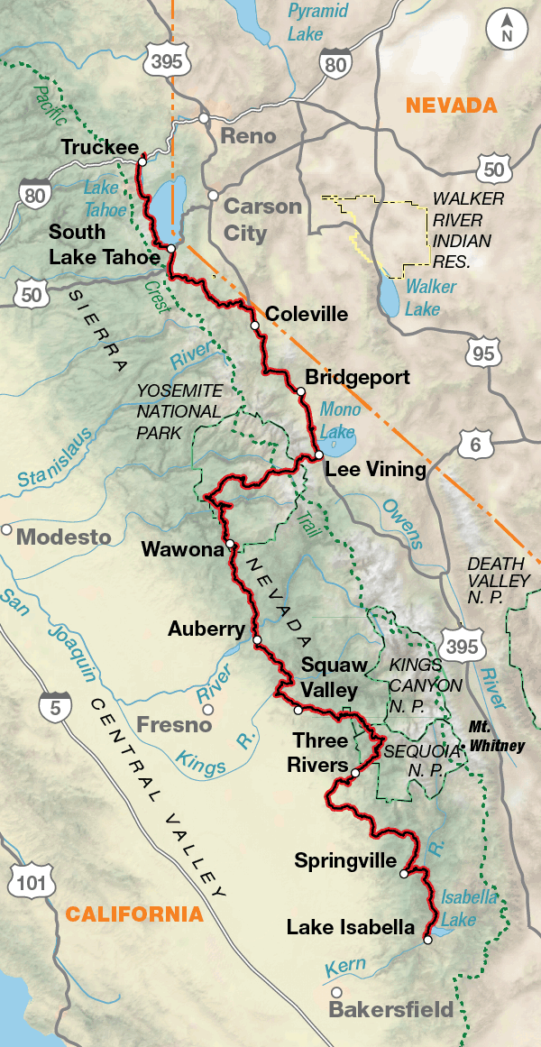 Since most of this route traverses recreation areas, whether they are national or state parks, national monuments, or U.S. Forest Service lands, you will need to plan ahead for your overnights. It’s difficult to find camping without reservations in Yosemite, King’s Canyon, and Sequoia parks. The areas around Lake Arrowhead and Big Bear Lake are also magnets for summer recreationists. Check opening/closing dates of roads over the passes if you plan on beginning your trip early or later in spring or fall.