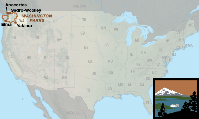 Section two of the Washington Parks Bicycle Route begins in Elma and heads east (counter-clockwise) into the foothills of the Cascades. Eatonville has its roots in the lumber industry. In spite of the closure of the mill in 1942, it continues to grow as a residential community and recreational jumping off spot for the region. Traffic volume increases as you approach Mt. Rainier National Park, especially June through August. As you leave the park, you will crest two mountain passes in rapid succession, Cayuse Pass and Chinook Pass. The grade of these ascents is roughly a steady 5-8%. From here it is mostly downhill to the cities of Yakima and Selah, situated on the Yakima River.