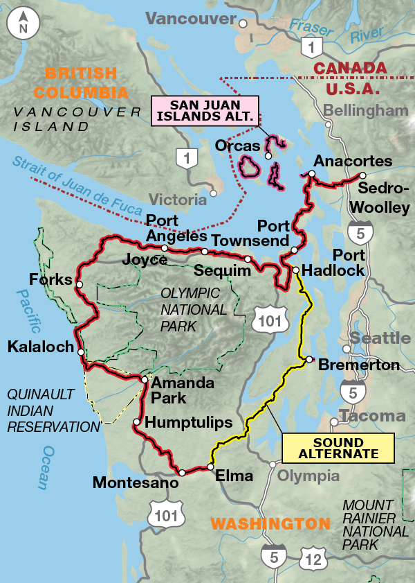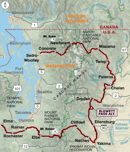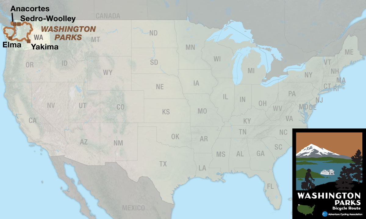 This double loop, two map section route showcases the diversity of the state of Washington, from its ocean and sound views in the west to the fertile orchards of the central Columbia Valley while traversing three national parks. The beginning and end points are technically Sedro-Woolley and Elma, though the abundance of ferries in and around Seattle allow great flexibility in planning.