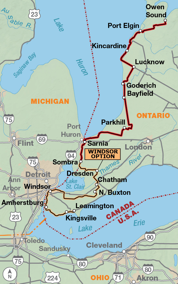 Northwestern Ohio and southeastern Michigan are mainly flat. You will find a few rolling hills between Adrian, Michigan and the outskirts of Detroit. After crossing the St. Clair River into Ontario, Canada, the route becomes hillier, even when riding along Lake Huron. There is a big descent riding to the route’s terminus at Owen Sound.