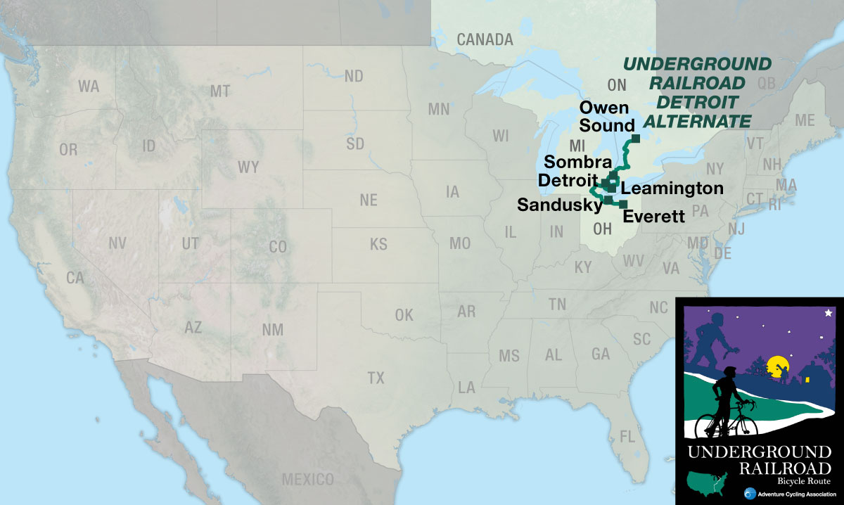 The Underground Railroad Bicycle Route (UGRR) memorializes the Underground Railroad, a network of clandestine routes by which African freedom seekers attempted to escape slavery before and during the Civil War. This page describes the 564.7-mile Underground Railroad Detroit Alternate route from Everett, OH, to Owen Sound, Ontario. You may also be interested in the main Underground Railroad Bicycle Route (UGRR), the UGRR Pittsburgh Spur, or the day-trip rides in Ripley, Ohio (PDF).